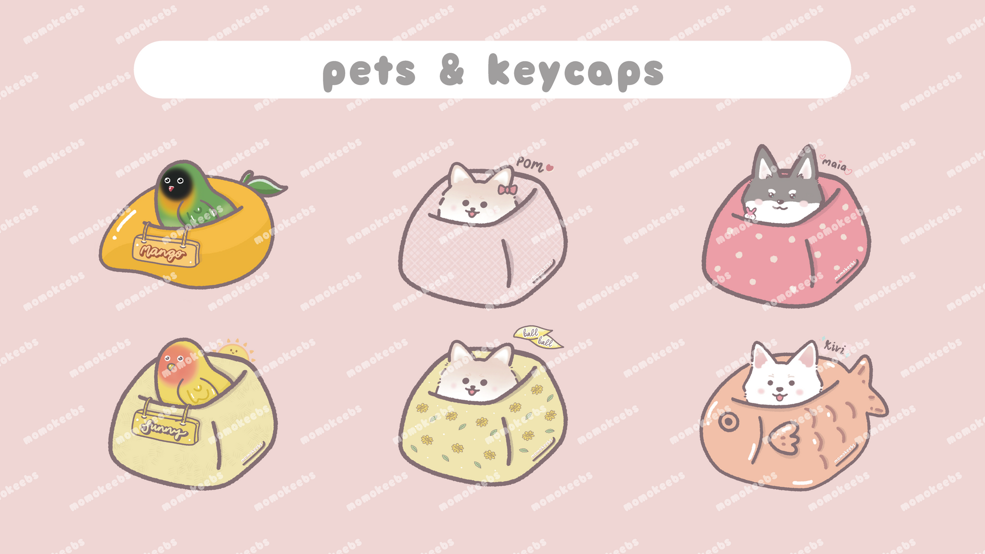 some examples are the orange cat in ameowzon box, pet in keycaps.